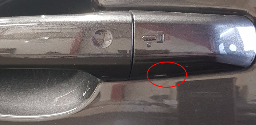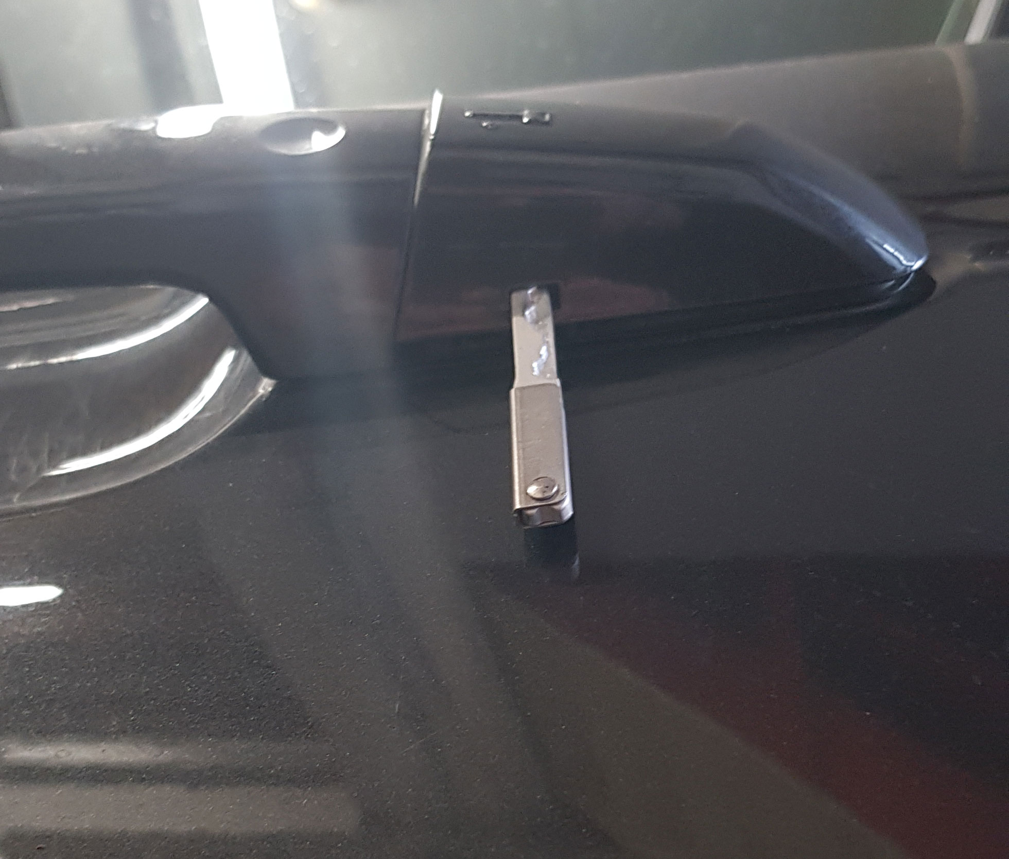 Stap 3: De sleutel baard steek je in de holte onder de bestuurdersdeur handgreep. Daar zit een kleine “usb achtige” opening. Je kunt dan door een kleine twist het kapje van de handgreep afhalen.